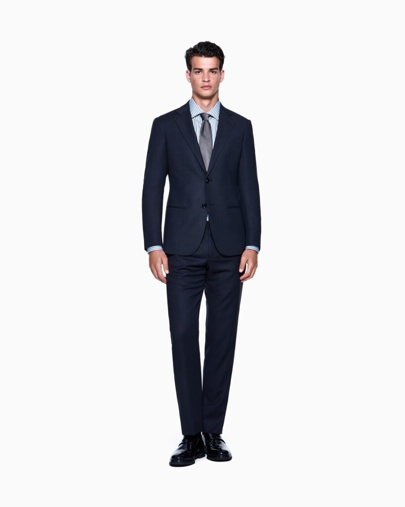 Giorgio Armani idzie w przeciwnym kierunku: miękkie konstrukcje, lekkie materiały, minimalistyczna elegancja. To garnitur dla kogoś, kto chce wyglądać bez wysiłku i czuć się komfortowo przez cały dzień.